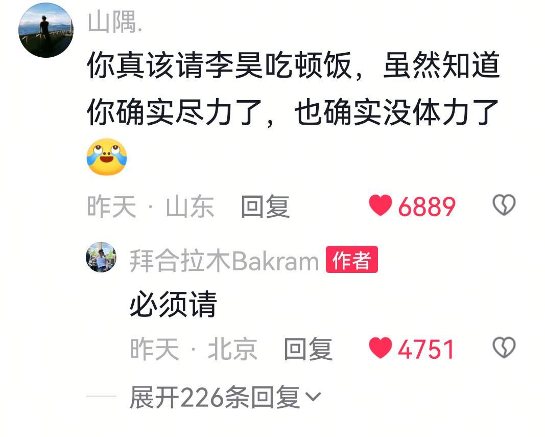 而拜合拉木在社媒也非常慷慨地表示,必须请队友李昊吃饭。
